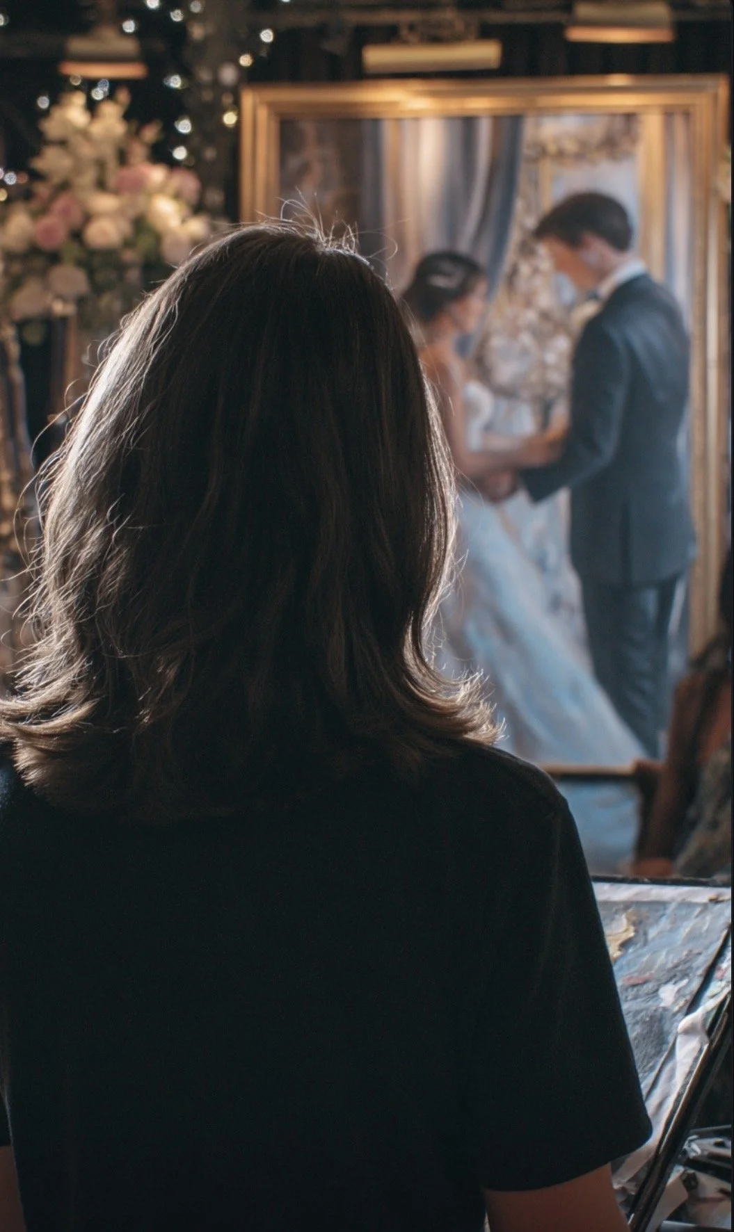 As your wedding day unfolds, the painting takes shape nearby — observing rather than interrupting, quietly recording the atmosphere and movement of the celebration as it happens.