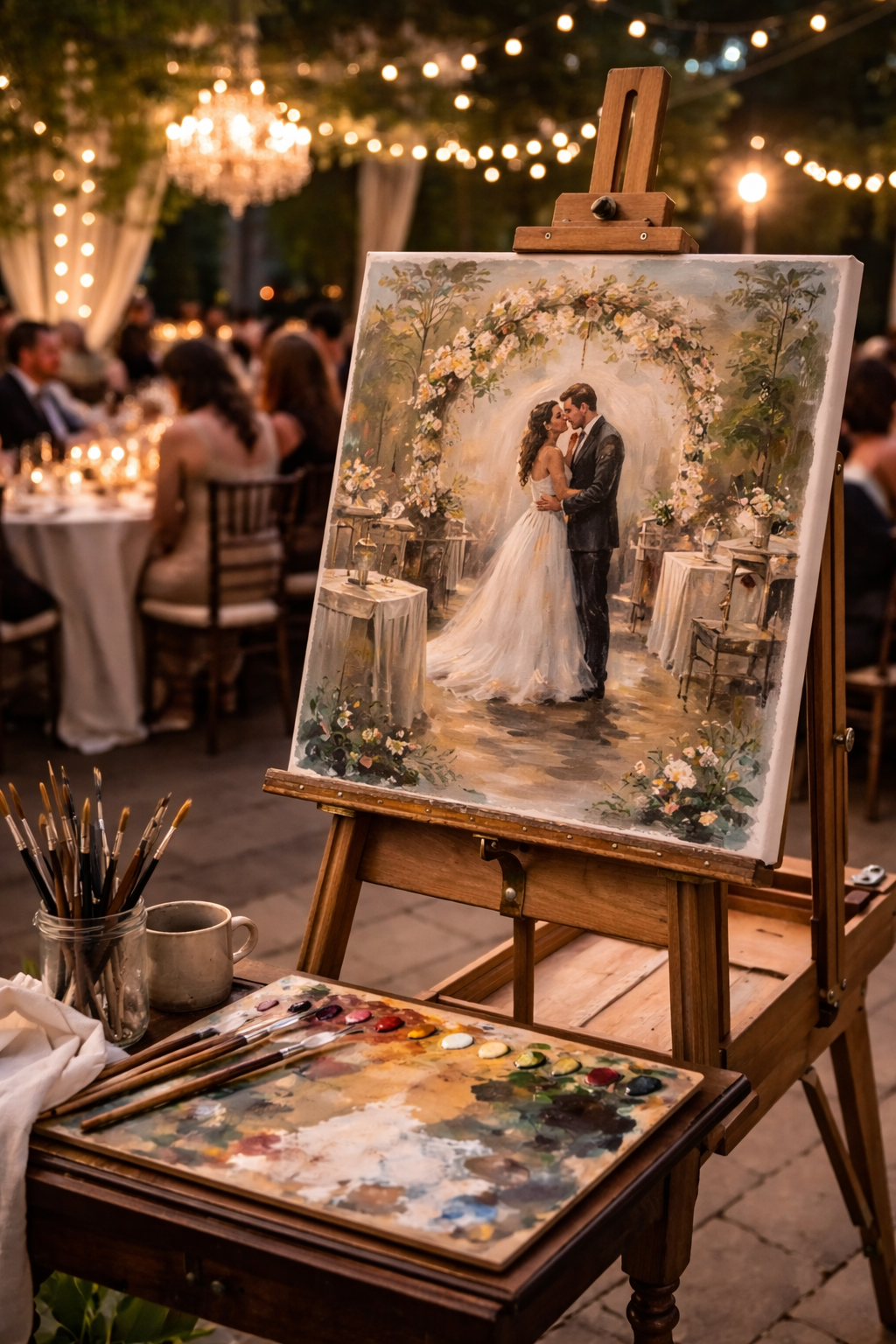 Before your wedding day, we begin with a confirmed availability check, followed by an introductory consultation by phone or email. During this conversation, we discuss your vision, the setting, the event timeline, and the specific moment you would like painted. Composition, lighting, and overall atmosphere are thoughtfully considered in advance so the painting feels intentional and cohesive from the first brushstroke.