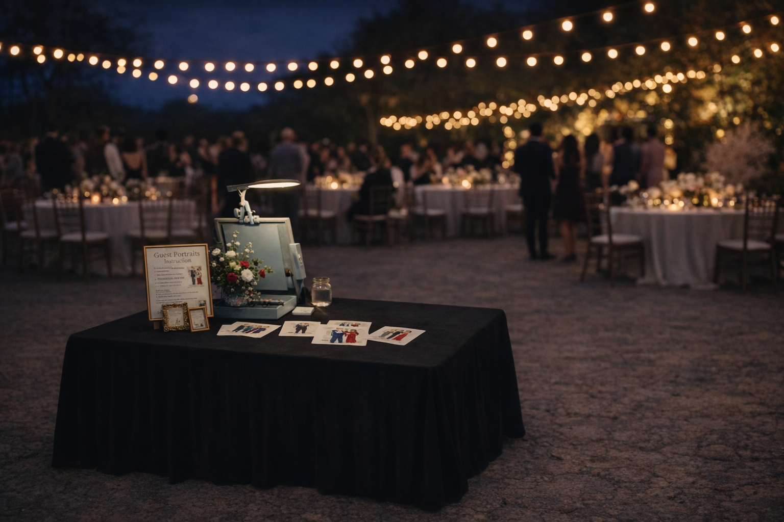 A small guest portrait station is set up at the venue, including a covered table and a tabletop easel. Clear, printed instructions are displayed at the station so guests know exactly how to participate.